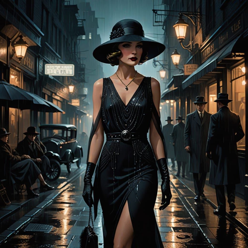 This moody, monochromatic image captures a sophisticated woman shrouded in a dark alleyway, her glamorous attire contrasting with the ominous atmosphere, as if danger lurks in every shadow, reminiscent of classic film noir