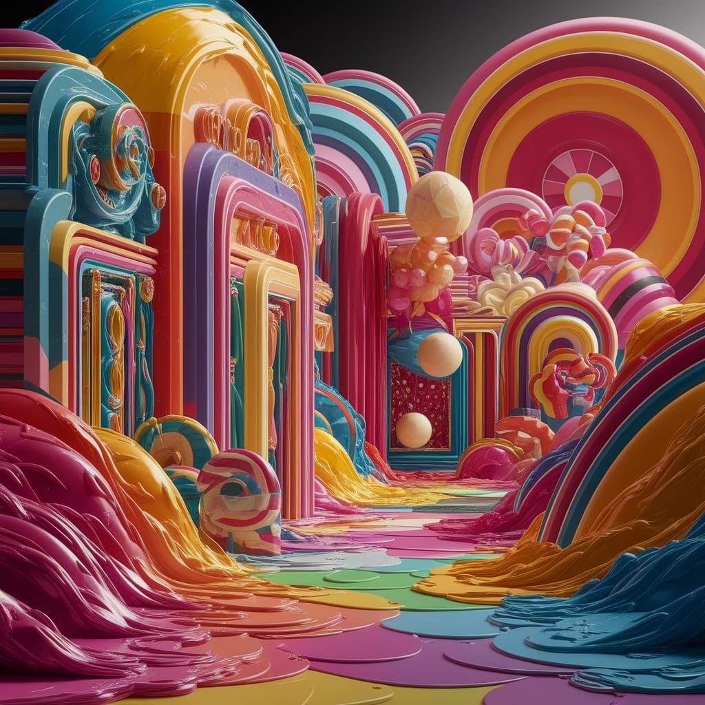 This image shows a vibrant cubist painting with layered geometric shapes in an Art Deco style. The artwork features swirling candy-colored elements and dynamic lighting, creating a high-contrast, textured composition reminiscent of digital matte painting.