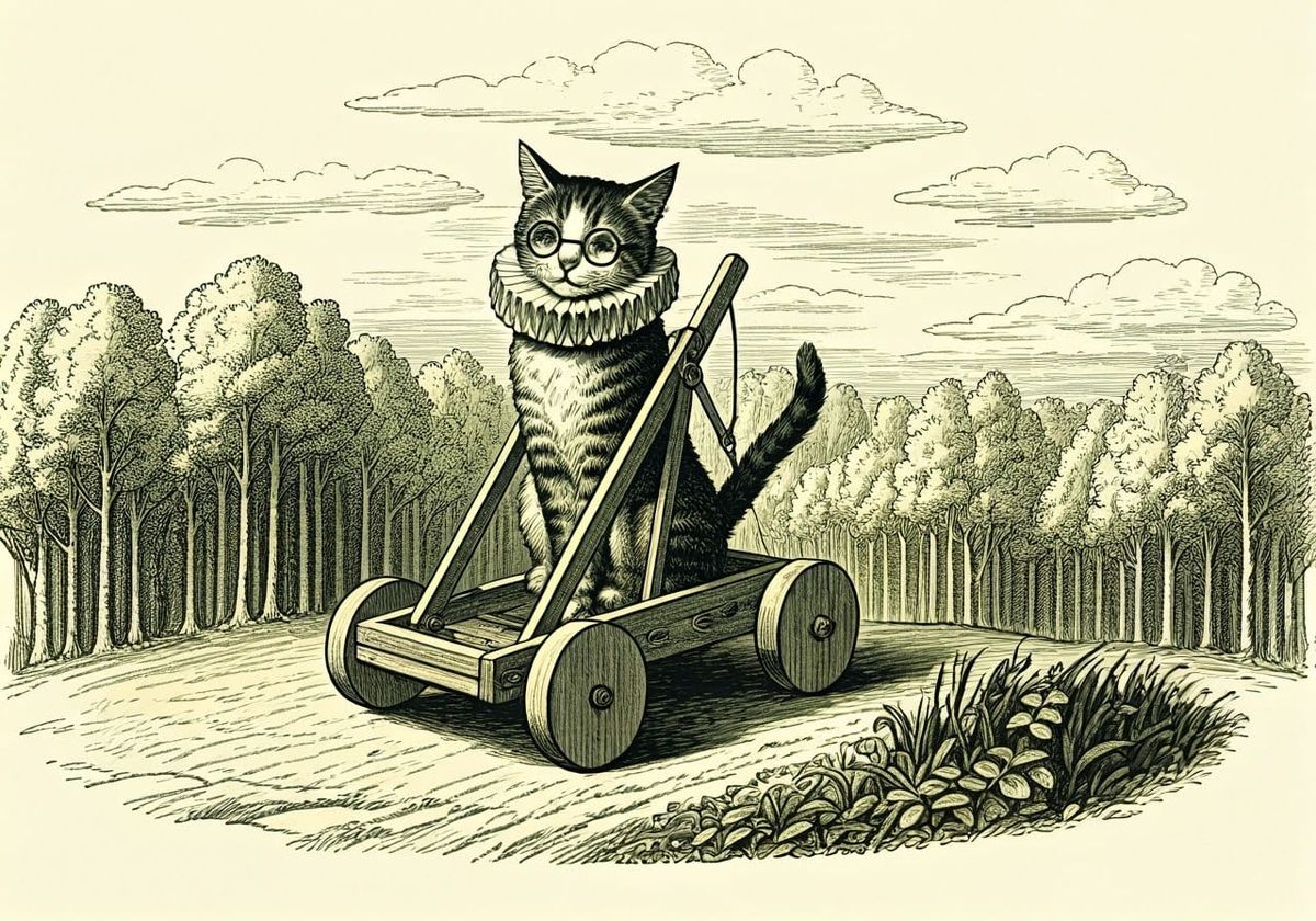 This enchanting illustration depicts a curious cat in a fantastical, dreamlike landscape, moments before being launched from a wooden catapult, with intricate line work and subtle textures reminiscent of 19th-century children's book art.