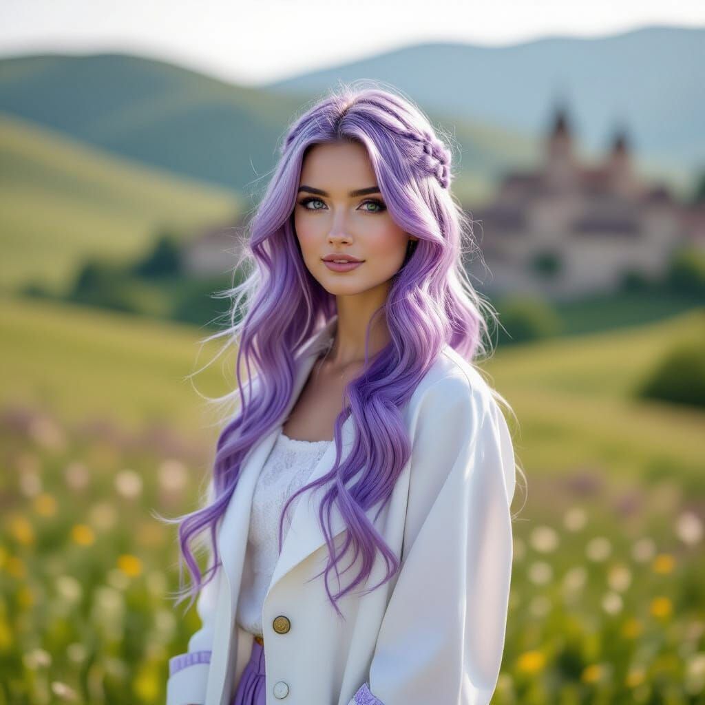 This image shows a lifelike young woman with lavender hair and violet eyes in a mage-style coat, standing outdoors in soft daylight. Shot with a shallow depth of field to highlight the subject.
