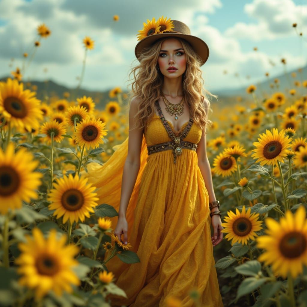 This image shows a flower-child hippie in a flowing sundress swaying in a sunny meadow of sunflowers, blending bohemian style with steampunk elements.