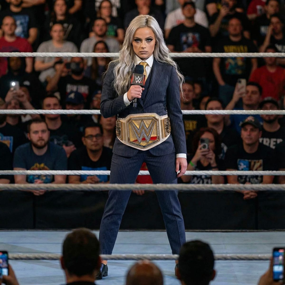 This image shows a WWE Women's Champion in a wrestling ring, holding a microphone and wearing a sharp suit. Dramatic lighting highlights her commanding presence and authority.