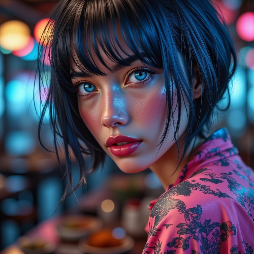 A hyperrealistic image of a masculine gynoid with striking blue-steel eyes and a retro French bob haircut. Features detailed skin, a shoulder tattoo, and an expressive, seductive look.