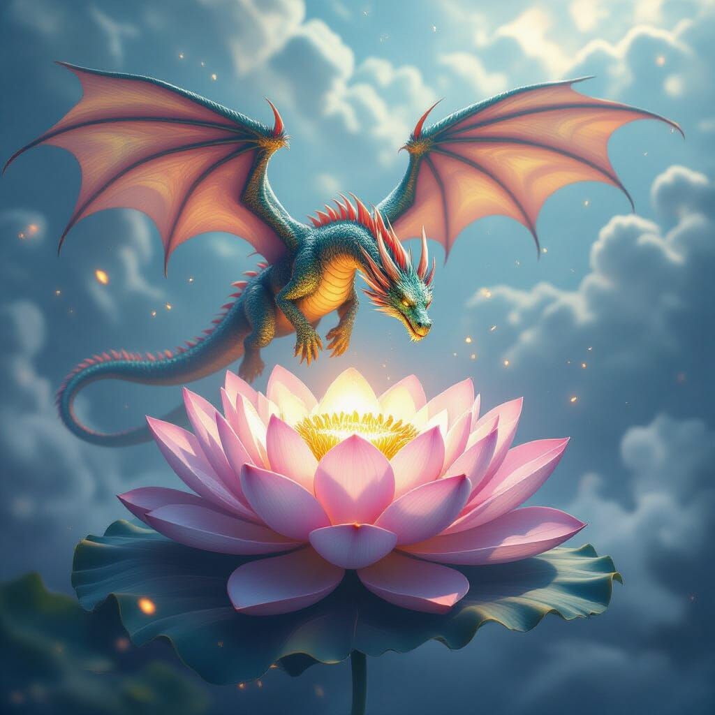 This image shows a majestic dragon with shimmering scales soaring above a giant, luminous lotus flower within a surreal, dreamlike environment filled with light particles and mist.