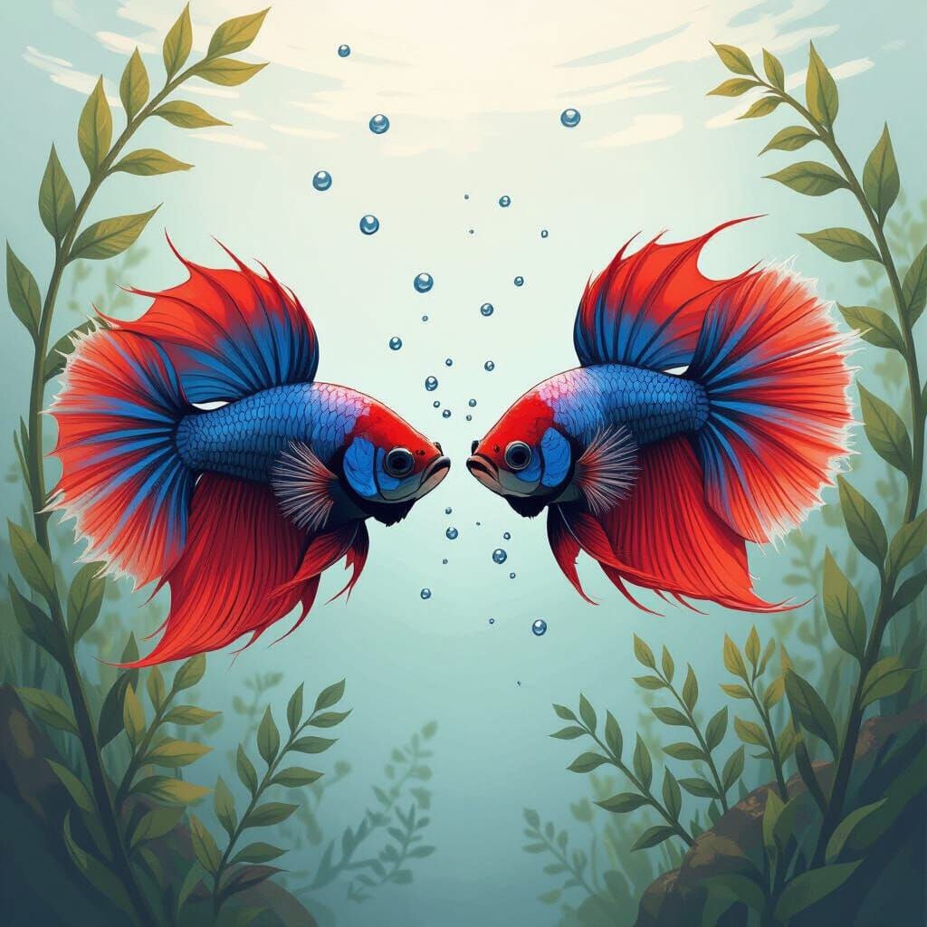 A vibrant image showing two Siamese fighting fish locked in combat. Rendered with dynamic brushstrokes and delicate water effects, the artwork has a painterly, digital aesthetic.