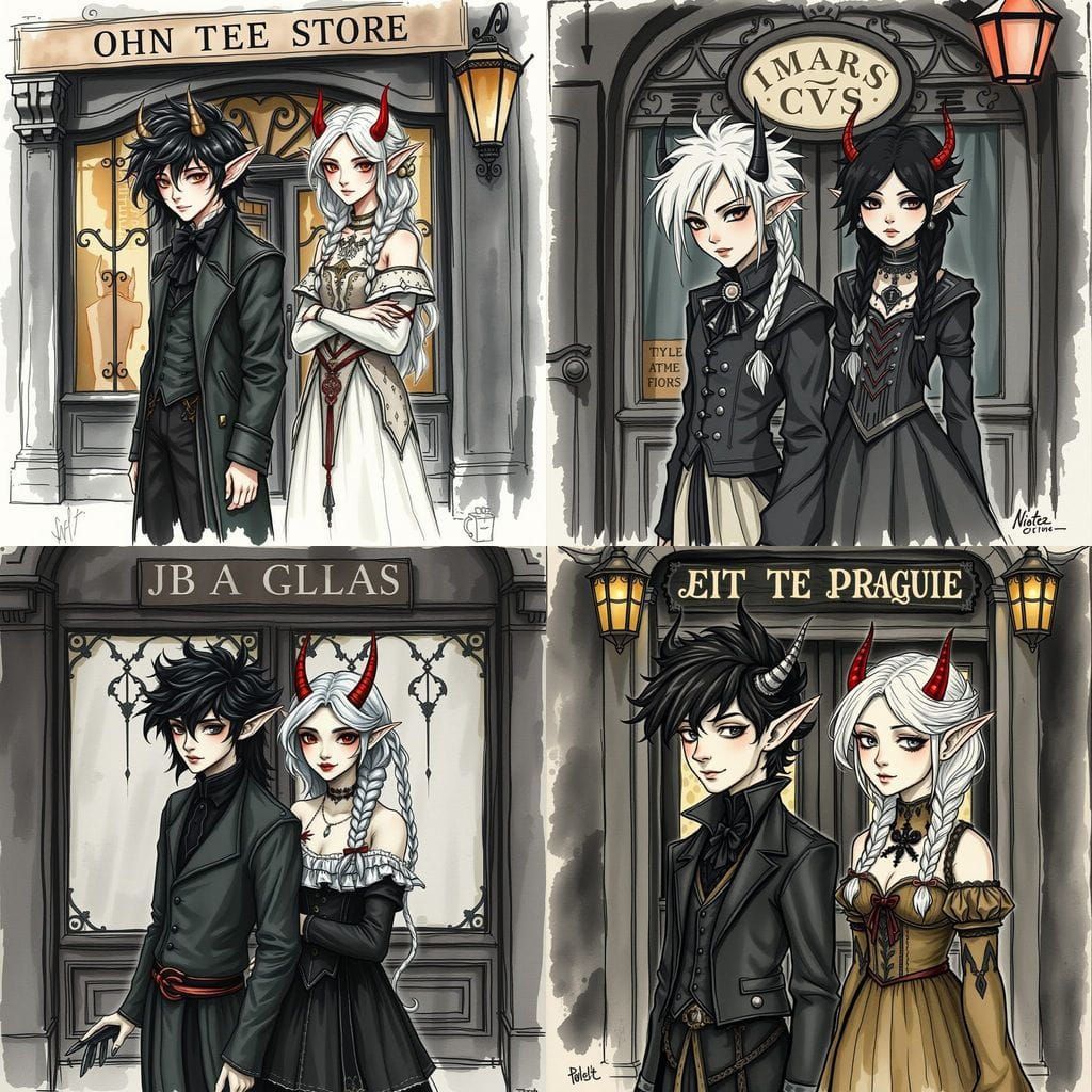 A charcoal sketch with watercolor splashes shows twin elves with devil horns in front of a store. The art nouveau style evokes early 20th-century expressionism.