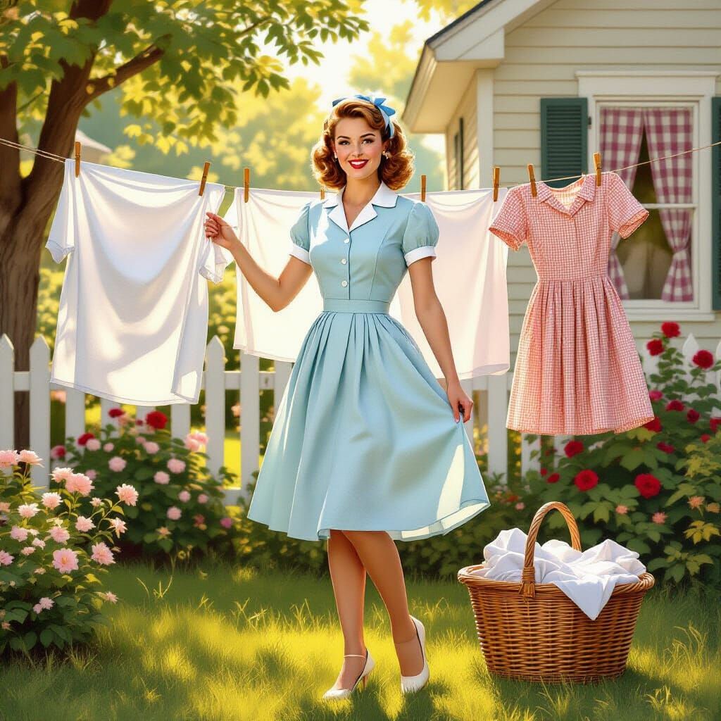 A vivid image of a young woman hanging laundry in her suburban backyard. The artwork evokes a nostalgic 1950s Americana aesthetic with photorealistic details and a warm color palette.