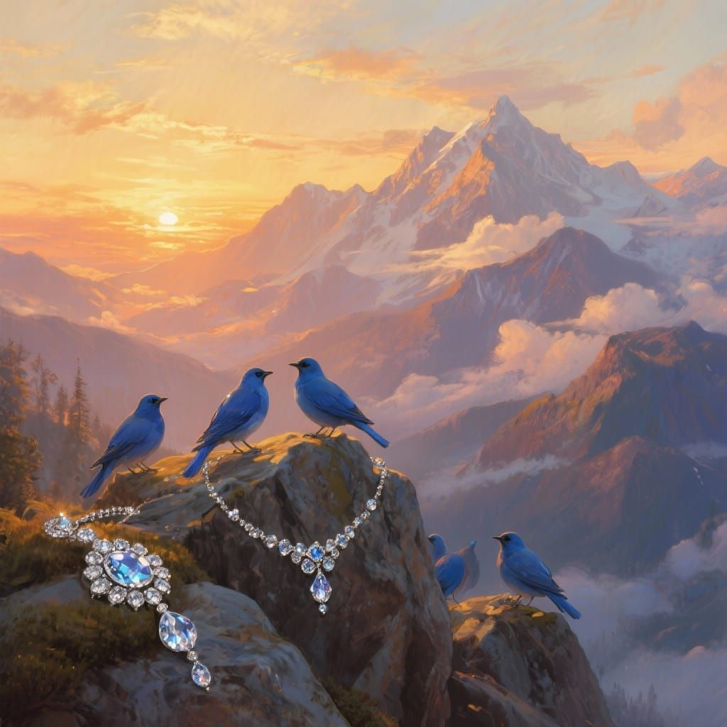 A stunning depiction of a golden hour sunset over mountains, featuring blue birds wearing sparkling crystal jewelry. Rendered in a detailed, painterly style with vibrant colors, evoking a sense of ethereal wonder.