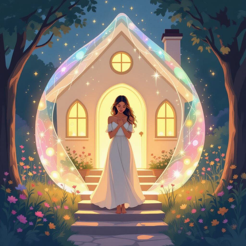 * Instead, it **flows around her like a protective, radiant aura**, softly shaped like stairs, windows, and cozy corners, but **all glowing, shifting, and alive**.