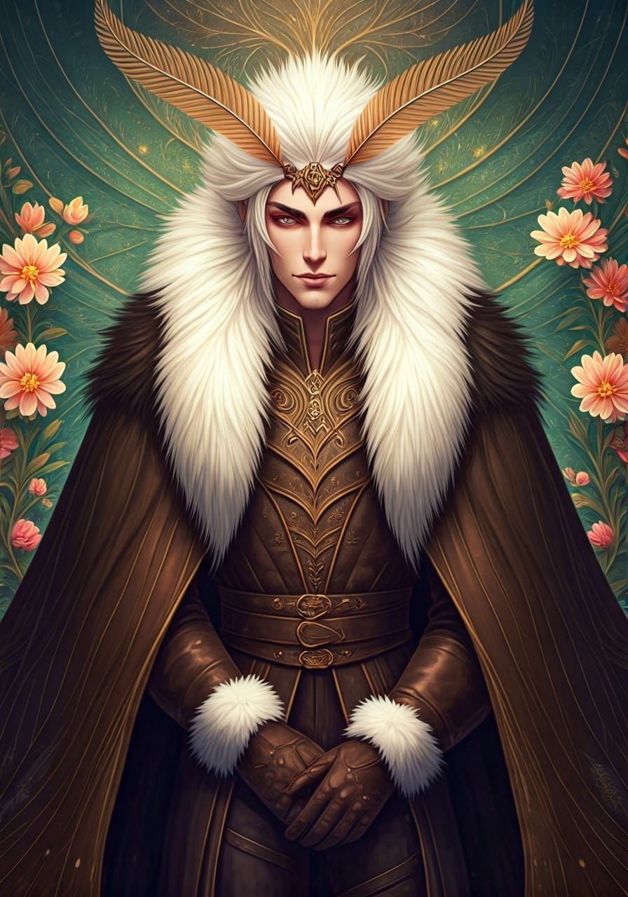 A striking picture of an ethereal moth insectoid in ornate armor. The elegant winged hybrid creature poses in a surreal, floral-filled world, rendered with vibrant colors and elaborate line art in a manga art style.