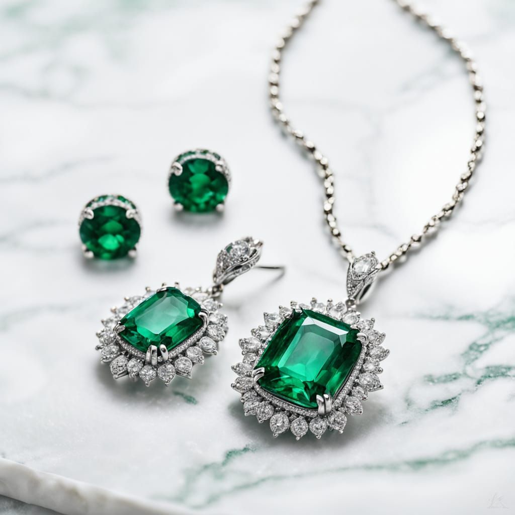 A close-up photograph of emerald jewelry displayed on white marble. The image highlights the intricate details of the necklace and earrings, showcasing the sparkling green gems under soft lighting.