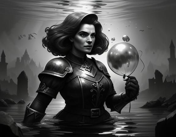 A striking picture of a plus-sized goblin cleric holding a balloon near submerged ruins. This macabre grey-scale illustration features hard shadows, dark ripples, and detailed textures reminiscent of pen and sketch art.