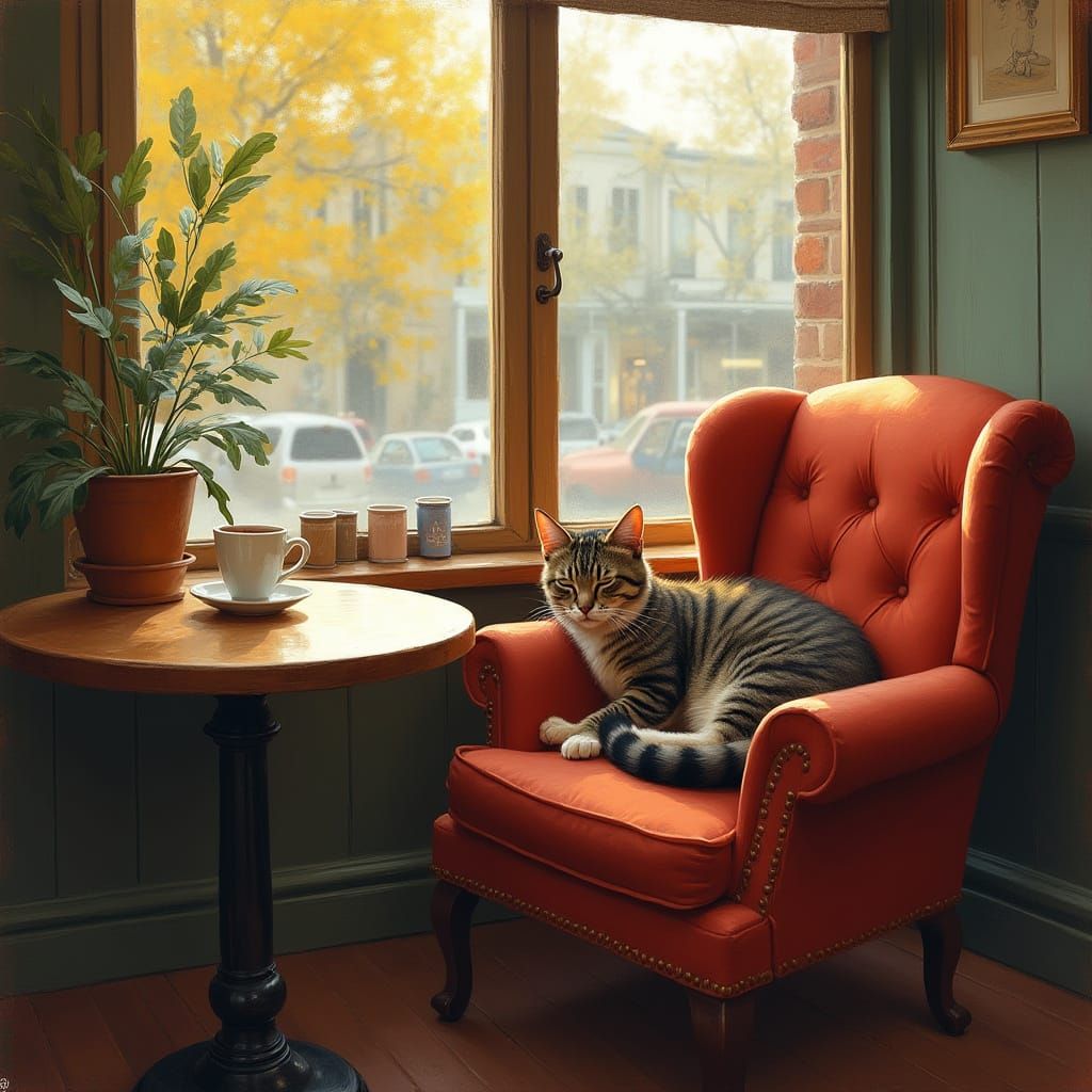 A warm and inviting coffee shop scene with a cat napping on a plush armchair. The image evokes a sense of calm, rendered with impressionistic brushstrokes to capture the soft light.