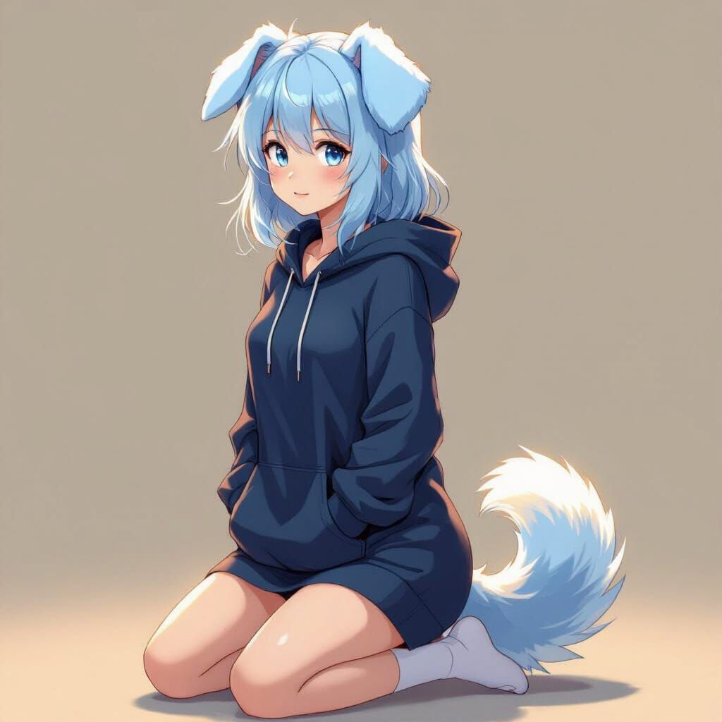 This image shows a young woman with light blue hair and dog ears and tail, wearing a hoodie-dress and socks. Rendered in a vibrant anime style with dynamic poses and glowing highlights.