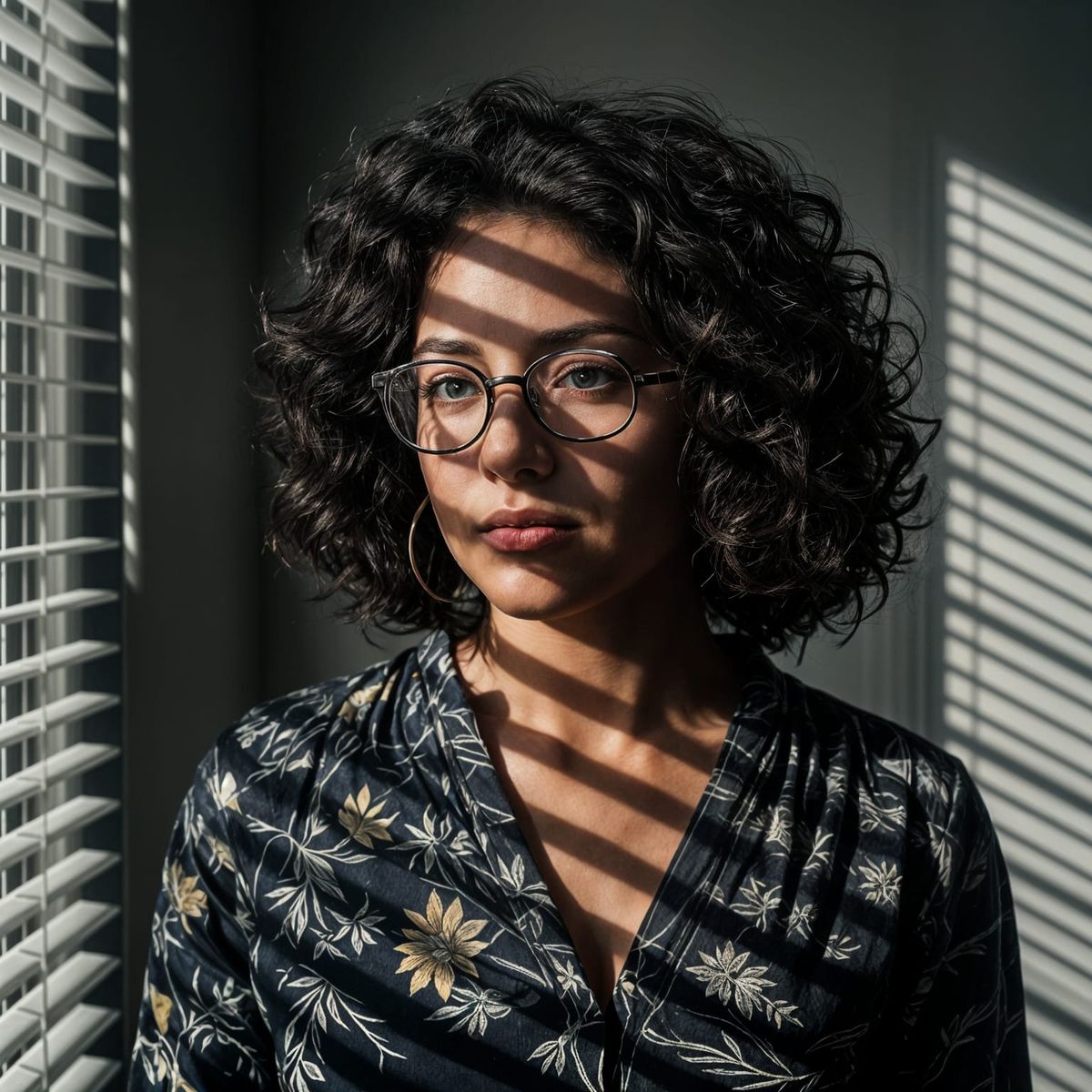 A woman with curly hair and glasses is captured in dramatic chiaroscuro lighting near a window. The image evokes a moody, film noir atmosphere with sharp shadows and deep contrast.