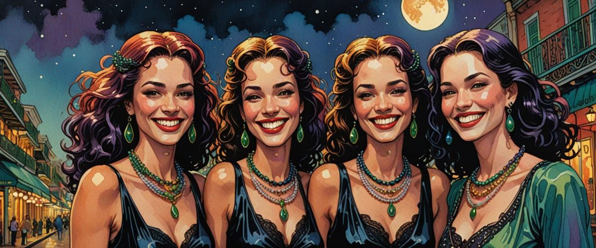 This watercolor and gouache image depicts four smiling goth women adorned with iridescent Mardi Gras beads on Bourbon Street in New Orleans, under a volumetric moonlit sky.