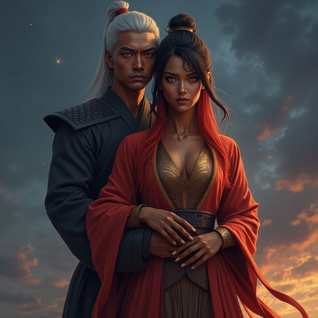 This image shows a fantasy scene of a woman in red and gold martial attire under a night sky. A man in black holds her, rendered as detailed matte painting with complementary colors.