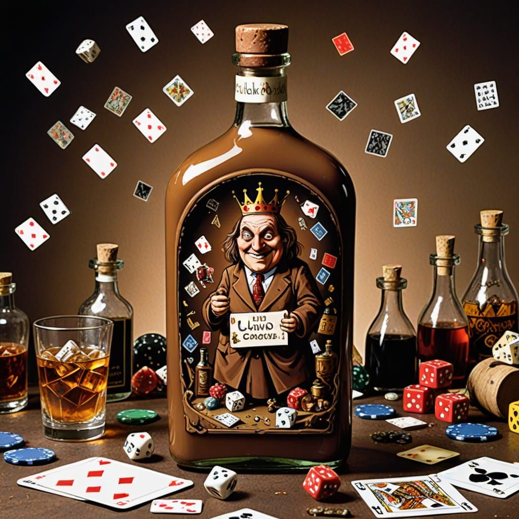 This image shows a humorous, gritty illustration of a mysterious potion bottle with dice, playing cards, and a cartoon character, evoking a chaotic and unpredictable scene reminiscent of Ralph Steadman's style