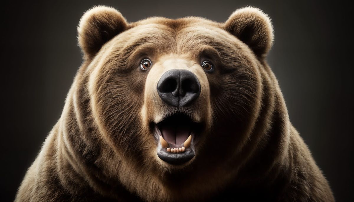 This image captures a photographic portrait of an obese Kodiak Bear with a look of surprised excitement. The studio setting emphasizes texture and detail, creating a masterpiece.