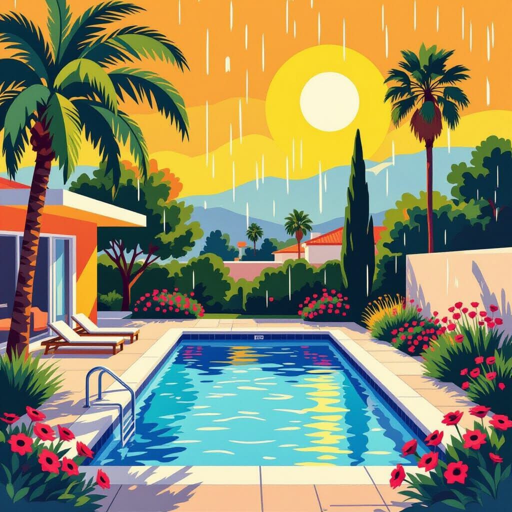 A vibrant pop art garden scene after a rain shower. The image evokes joy with bright colors, flat shapes, and clean lines, reminiscent of Hockney and Lichtenstein.