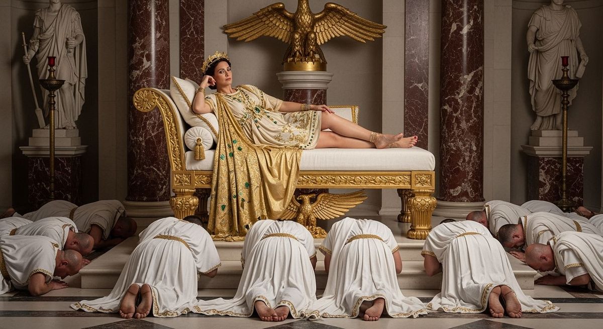This image shows Empress Messalina in a gold toga, barefoot on a marble chaise lounge. Roman senators kneel before her in a luxurious throne room with marble columns and gold accents, captured with sharp focus.