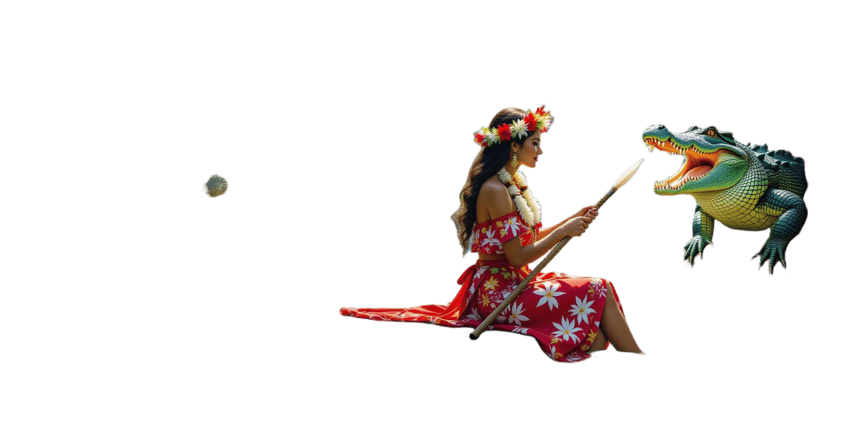 This image shows a Hawaiian woman warding off a crocodile with a stick. The scene is a detailed matte painting with a deep color spectrum, fantastical details, and complementary colors, reminiscent of fantasy concept art.