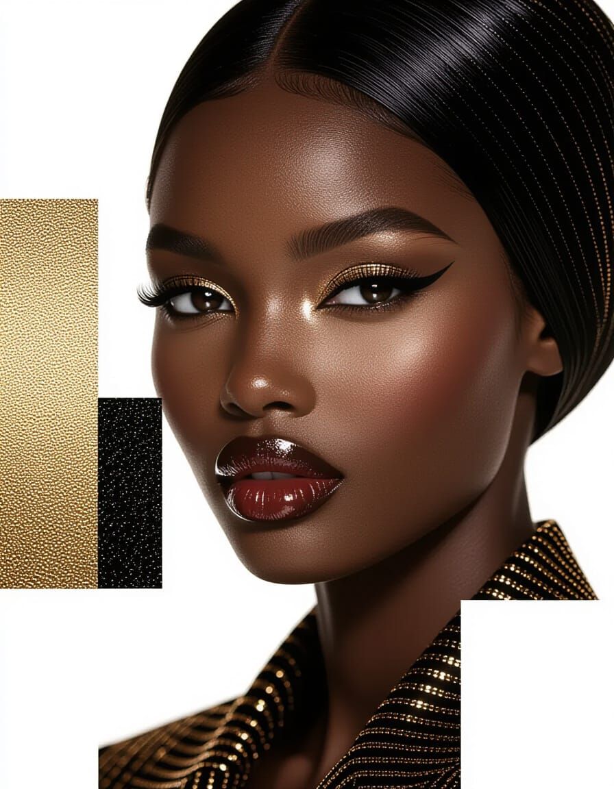 This image shows an elegant African American woman's face sculpted from runway magazine clippings. The high-contrast lighting and metallic shimmer create a chic, fashion-editorial aesthetic.