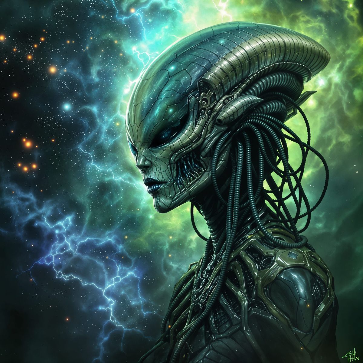 This image shows an AI generated rendering of an alien woman surrounded by emojis. The emojis include sparkles, stars, radiation symbols and television screens.