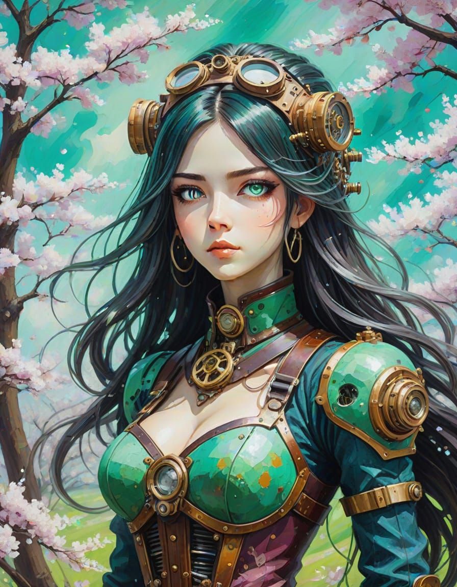 A striking picture of a steampunk woman with jade eyes in a cherry blossom field. The figure dissolves into a celadon watercolor splash as 3D shading and digital painting create an atmospheric scene.