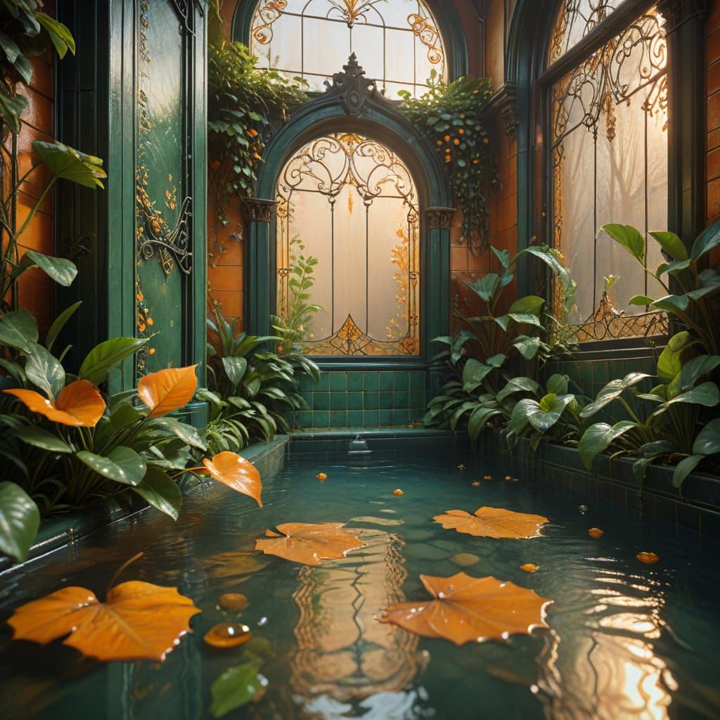 An elegant Victorian indoor swimming pool rendered in an Art Nouveau oil painting style. Features liquid leaves, intricate details, and diffused amber and green lighting.