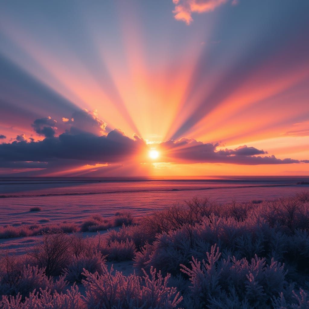 This image captures a breathtaking sunrise over a surreal landscape, with vibrant colors and morning frost, creating a sense of depth and wonder.