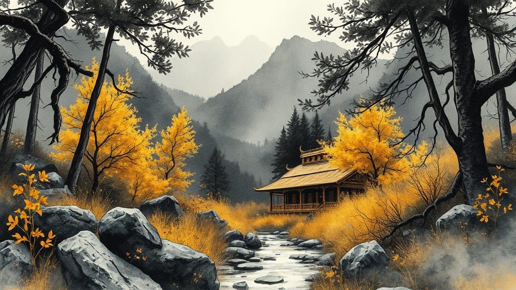 This image shows a serene nature scene in a beautiful watercolour style with gold and black ink effects, evoking an ancient aesthetic