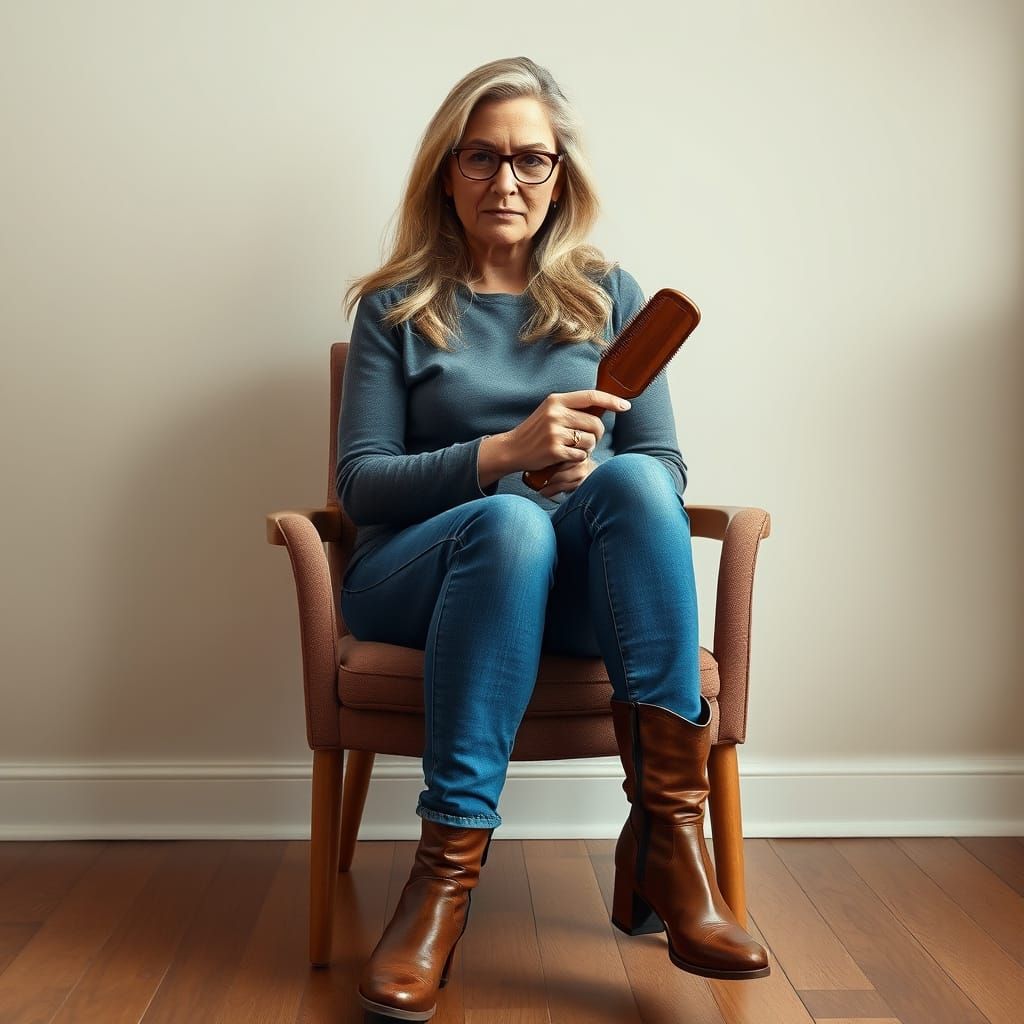 This image shows a realistic portrait of a mature woman with long blonde hair and glasses, seated and holding a hairbrush. The artwork is photorealistic with subtle textures.