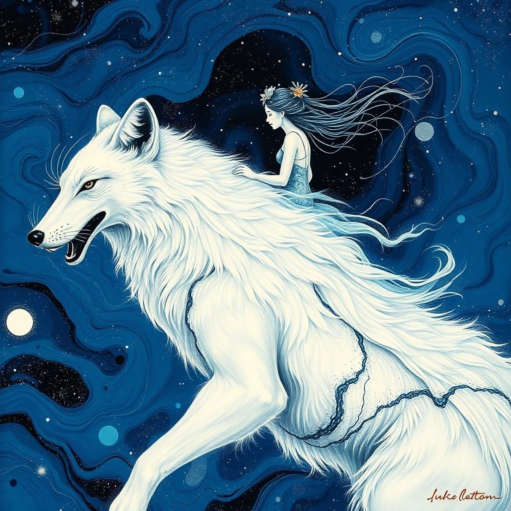 This image showcases a captivating woman amidst a vibrant, psychedelic universe. It blends Japanese ink wash, Aboriginal dot art, and fluid silk painting techniques for a mystical, ethereal aesthetic.