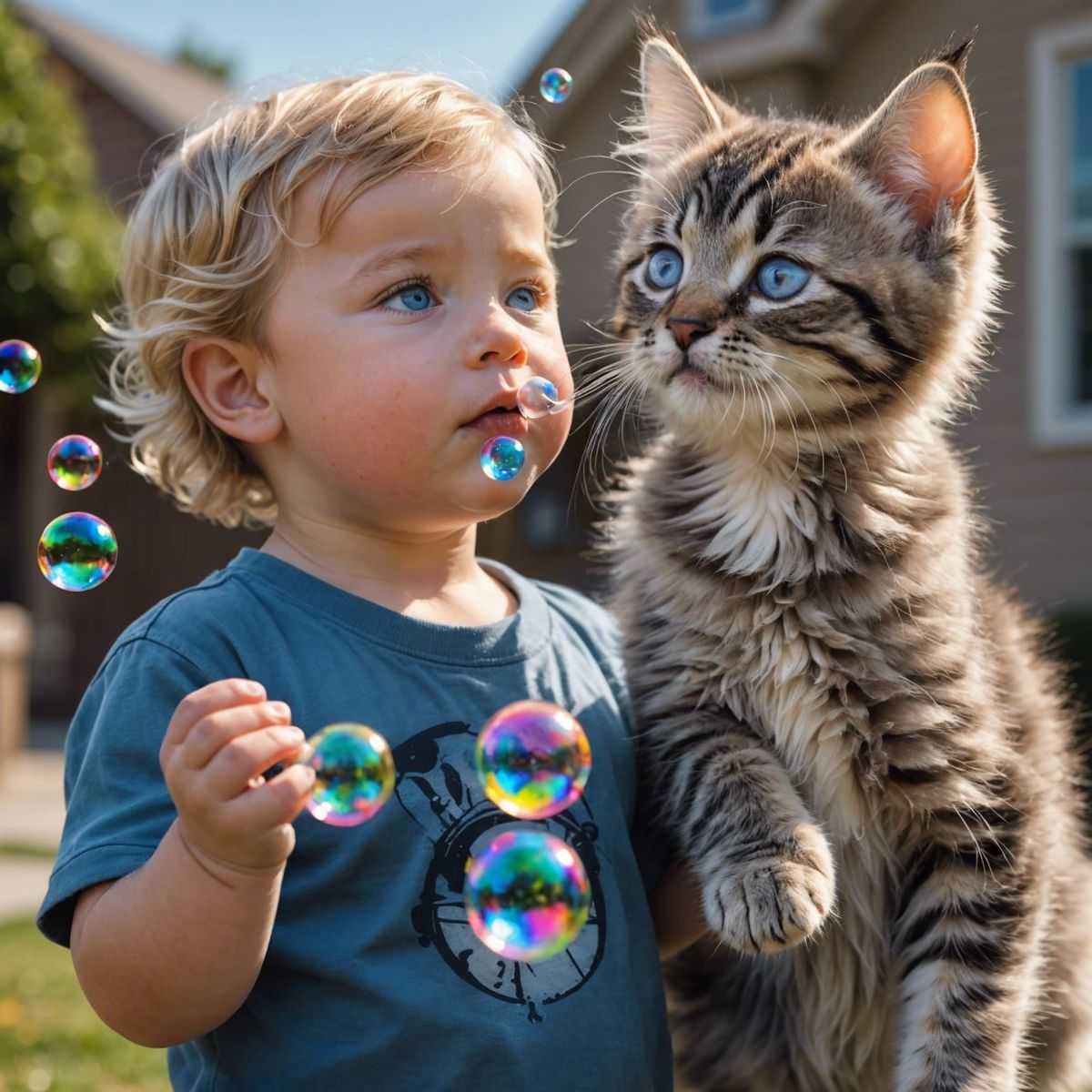 This image shows a blonde, blue-eyed toddler blowing bubbles outdoors with his father and a gray kitten. The hyperrealistic image employs a splash art style and dramatic side lighting.
