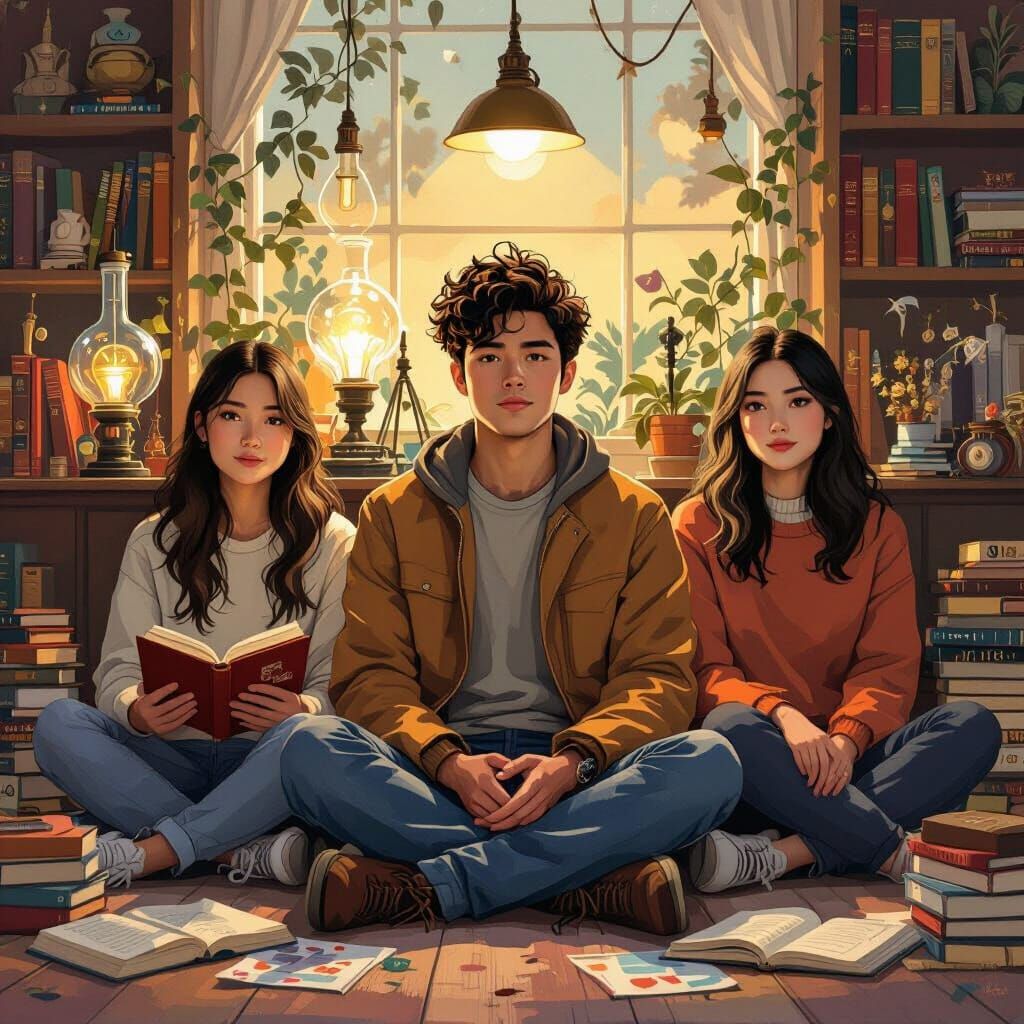 This image shows diverse people in calm poses, surrounded by books, inventions, and art, with soft, warm lighting. The image is in a whimsical collage style with layered textures.