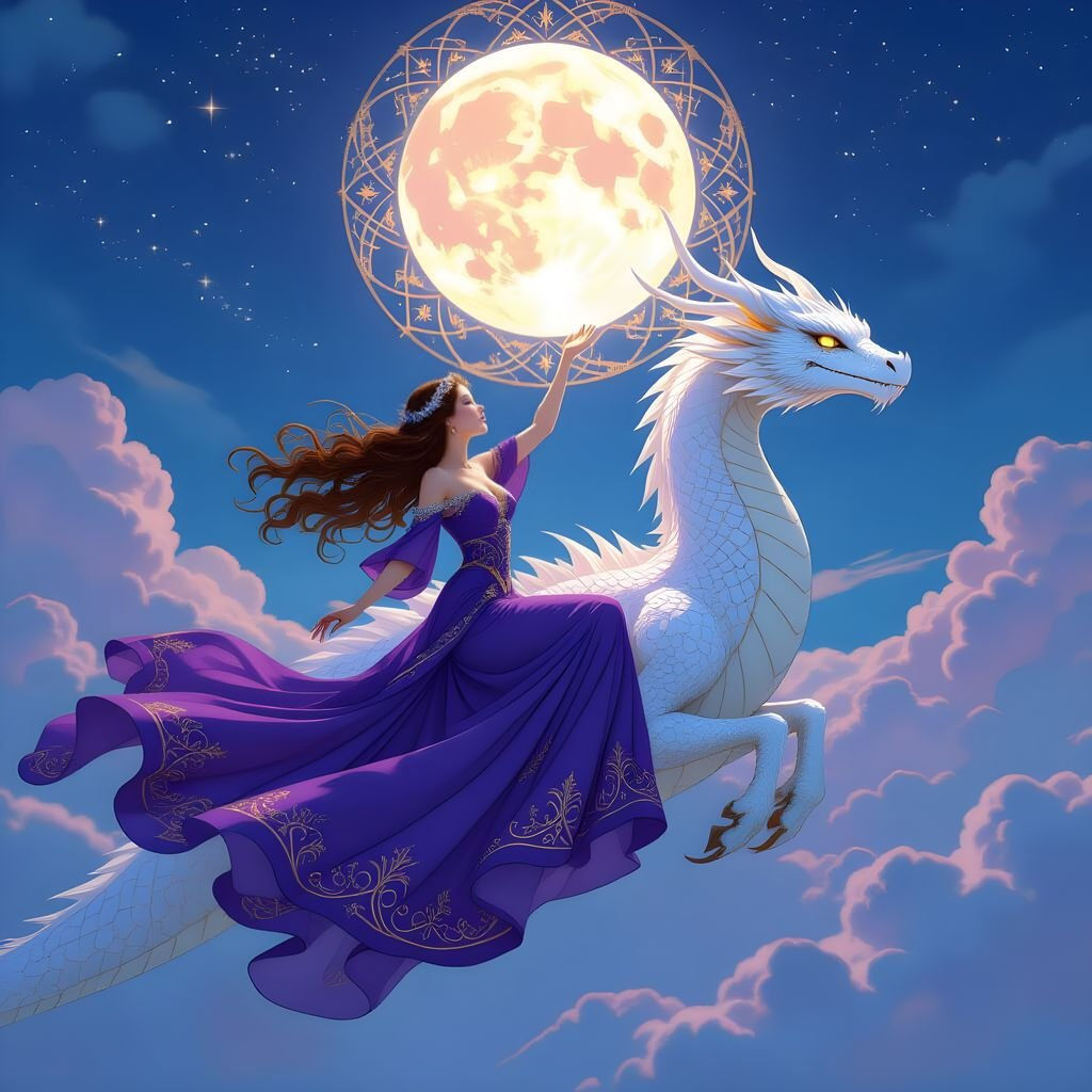 "Brown haired woman in a violet gown rides a white dragon toward a stone in the clouds, rendered layered color palette that emphasizes the heavenly elements. This piece is inspired by the detailed linework and ethereal quality of Art Nouveau. detailed matte painting, deep color, fantastical, intricate detail, splash screen, complementary colors, fantasy concept art, 8k resolution trending on Artstation Unreal Engine 5"
