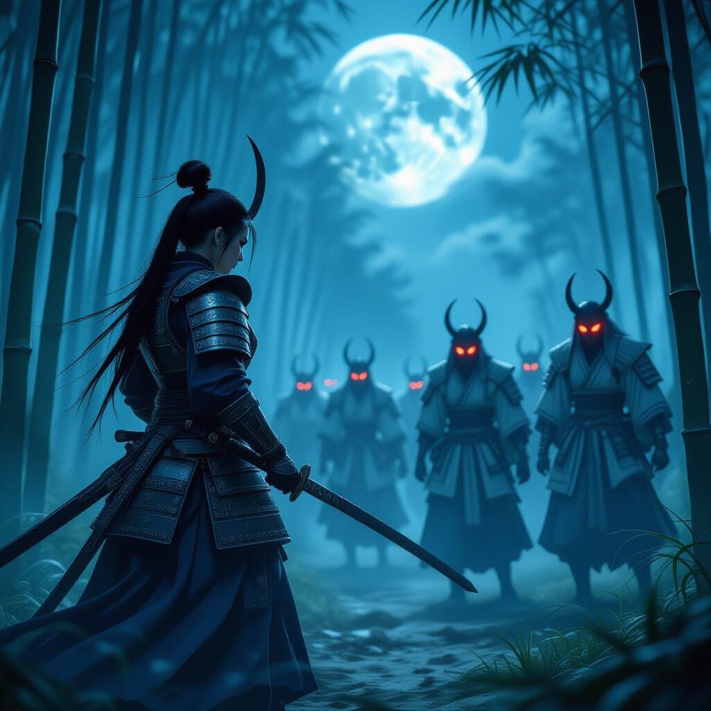This image shows a stoic, armored samurai warrior confronting a legion of spectral oni in a bamboo forest. Captured with cinematic quality and intense lighting, it resembles a dynamic anime action scene.