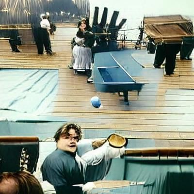 This image shows a humorous portrait of Jack Black playing ping pong on the Titanic. The artwork is a digital rendering with vibrant colors and dramatic lighting.