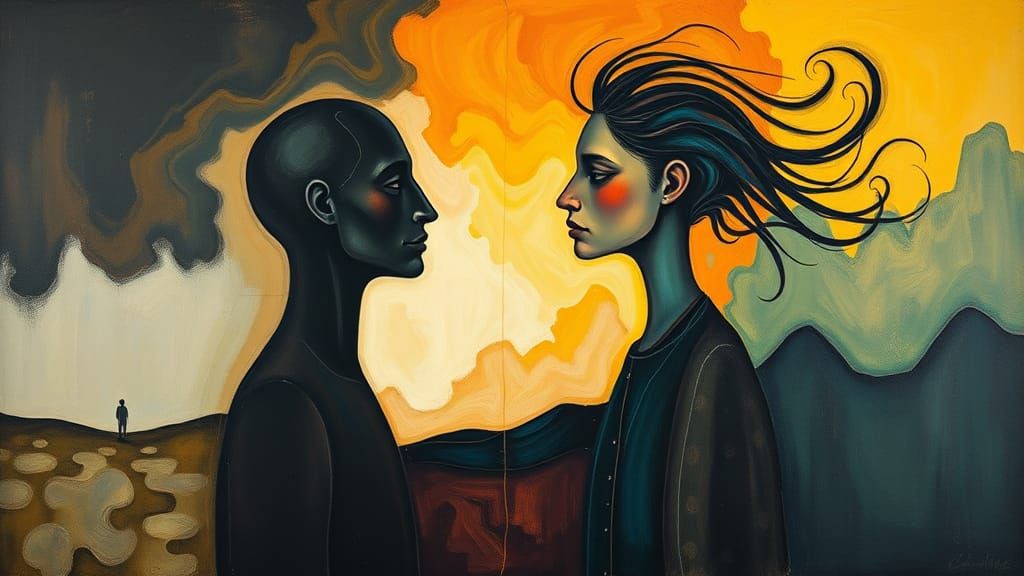 This abstract painting depicts the clash between two education approaches, featuring two figures with contrasting styles and emotions, set against a vibrant backdrop of swirling colors and forms, representing the complexity of human experience and the pursuit of truth.