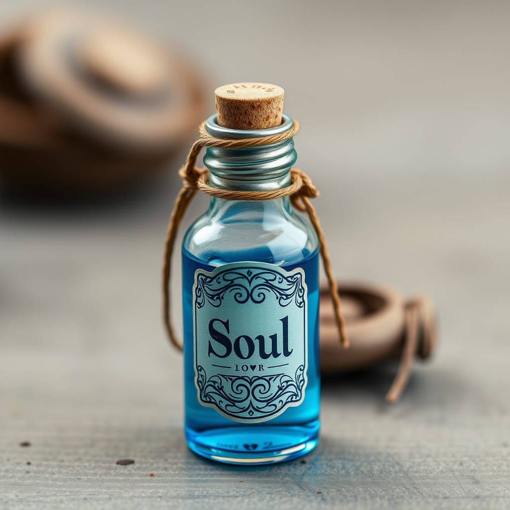 A beautiful woman holds a tiny, intricately designed bottle tied to her neck, adorned with a sign reading 'Soul' in a vintage, mystical style.