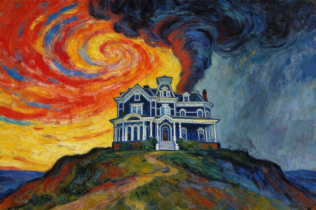 This image depicts the eerie Victor Creel house in a tornadic, post-impressionistic expressionist style reminiscent of Edvard Munch. Ominous atmosphere.