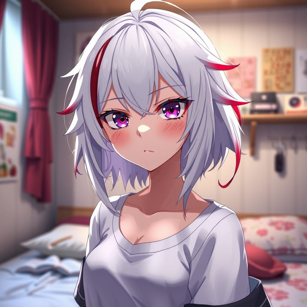 This 3D anime art image features a girl with striking white hair and red streaks, along with piercing red-purple eyes, as she displays annoyance in a shared room with her friend. Rendered in exquisite detail, the image blends digital painting and anime styles, reminiscent of Genshin Impact's stylized vis...