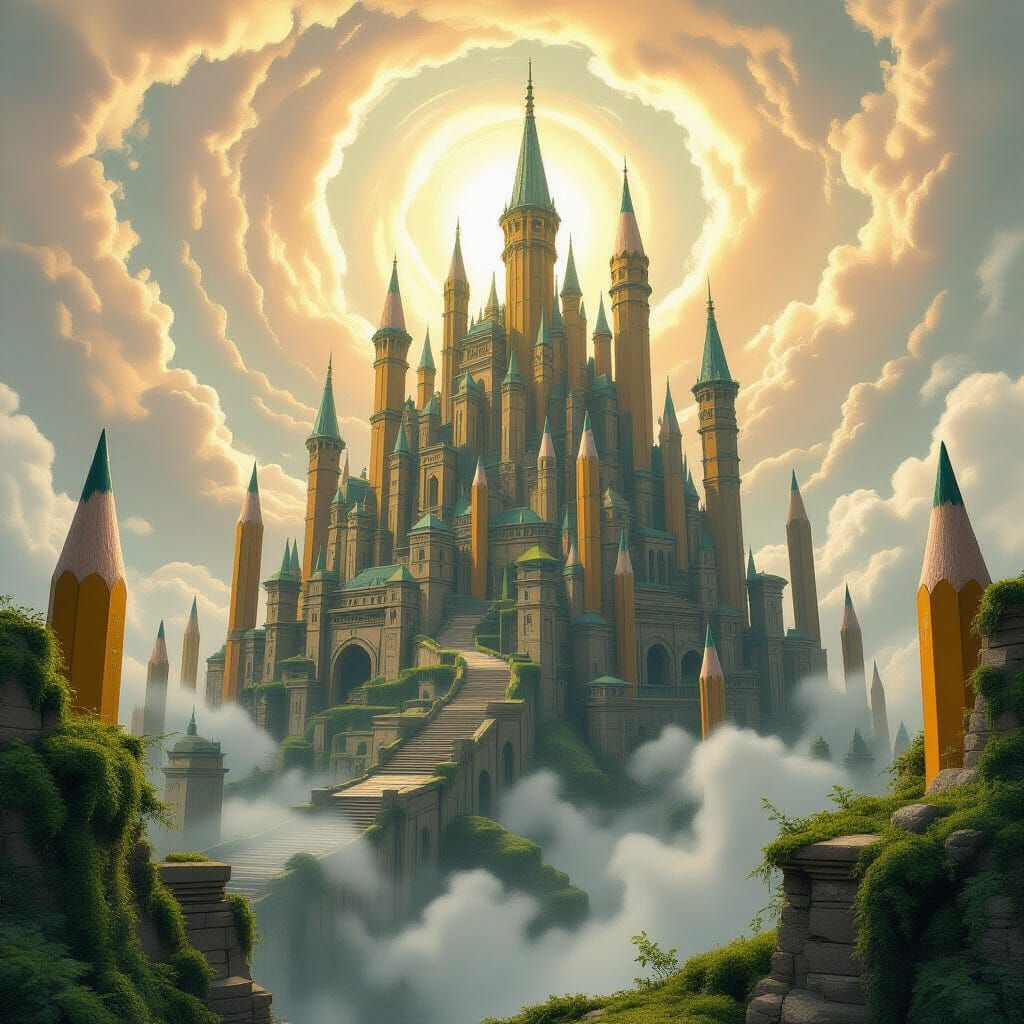 A digital matte painting of a forgotten city built from giant pencils, covered in moss. Features a swirling sepia sky and soft lighting, evoking quiet decay.