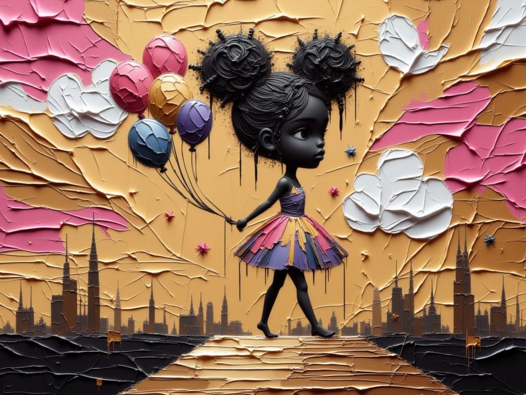 A striking picture of a Black girl holding colorful balloons against a vibrant cityscape. The artwork features thick impasto and short brushstrokes, reminiscent of quilting and psychedelic digital art.