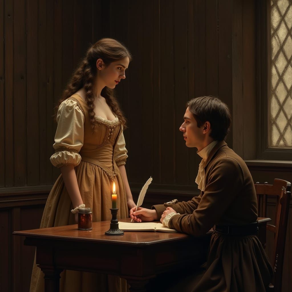 This image shows a woman in Elizabethan dress standing in a candlelit room as a poet gazes at her. The artwork evokes the style of Dutch Golden Age painting with warm colors and natural light.
