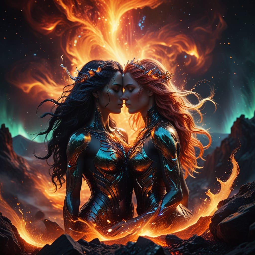 A striking picture of two entwined priestesses on a volcanic platform. The digital painting features swirling hair, magical sparks, luminous mist, and photon auroras in warm golden hour lighting with complementary colors.