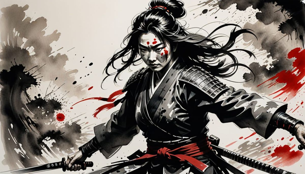 This image shows Tomoe Gozen, a female samurai, in battle. The Sumi-e style art features bold black and white tones with crimson accents, capturing the elegance and violence of the scene.