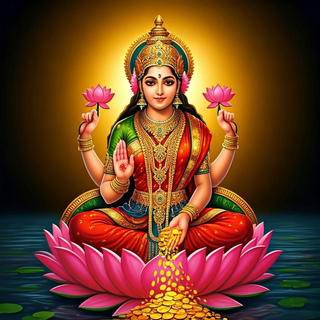This image shows Lakshmi seated on a lotus in a golden pond, showering gold coins. The artwork evokes traditional Hindu art with intricate patterns and a peaceful, divine aesthetic.
