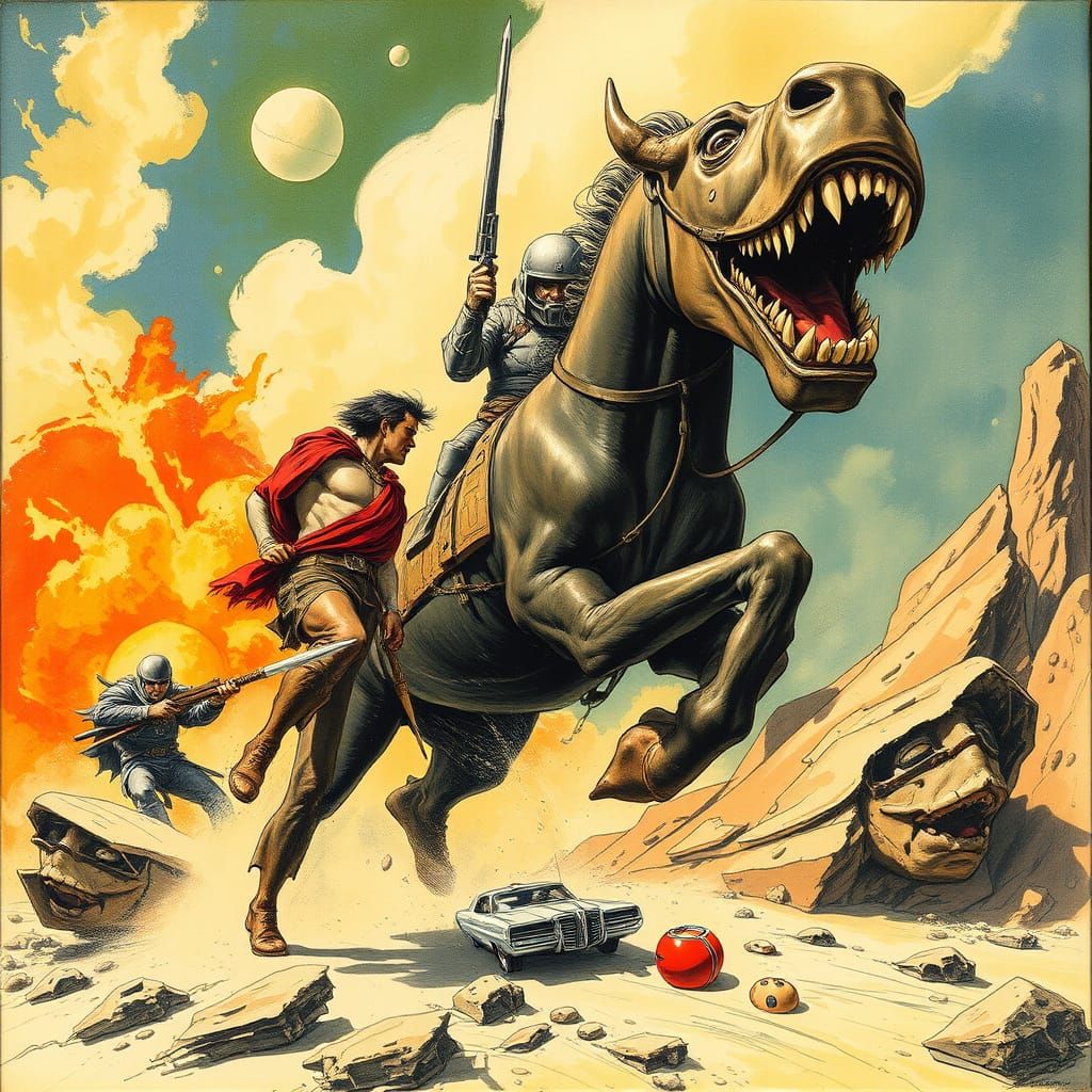A dynamic scene reminiscent of classic fantasy and sci-fi art. The composition, color, and anatomical exaggeration evoke a blend of heroic fantasy and visionary futurism.
